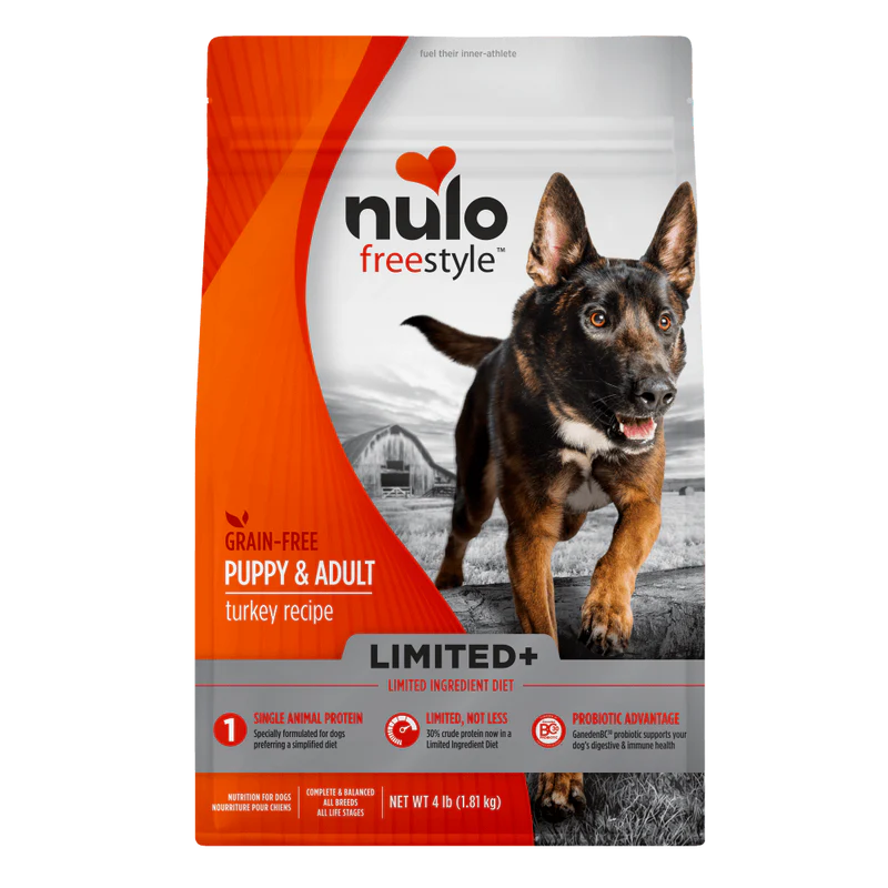 Designed for dogs who prefer simpler diets, Nulo FreeStyle Limited+ features a single protein source, minimal carbs, and no fillers. Each recipe includes GanedenBC30® probiotics, omega fatty acids, and antioxidants to deliver full nutrition with fewer ingredients.